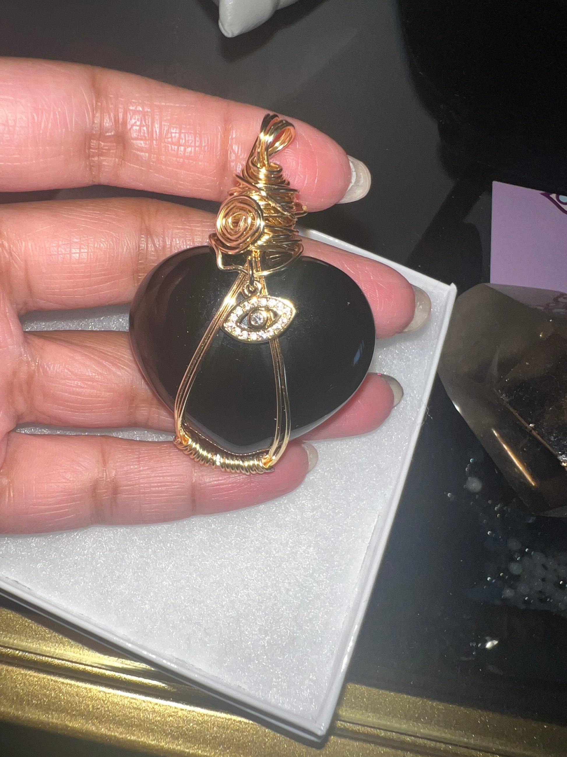 Black Obsidian Evil Eye Heart Pendant (18K Gold Wrap)