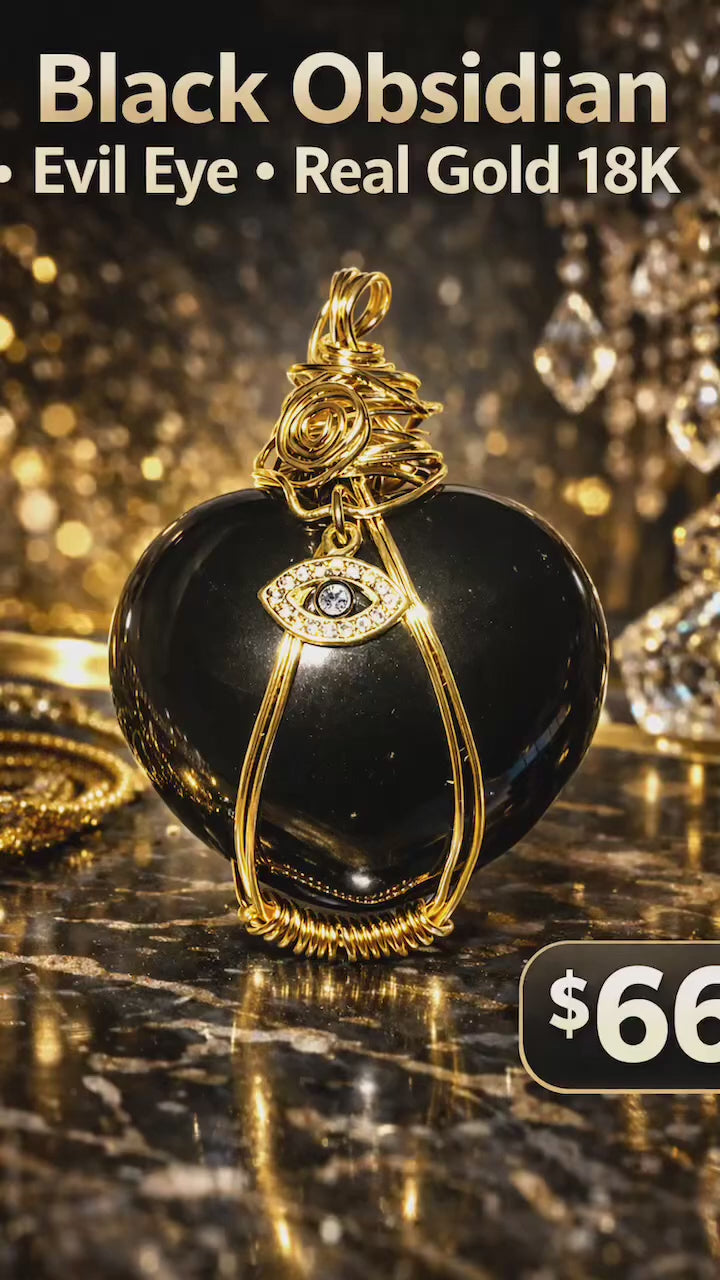 Handcrafted Black Obsidian Heart Pendant wrapped in real 18K gold wire with a protective Evil Eye charm.