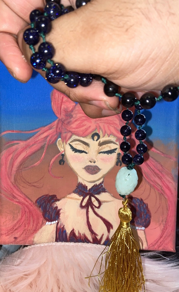 This handcrafted mala necklace is a radiant blend of cosmic protection and calming balance.