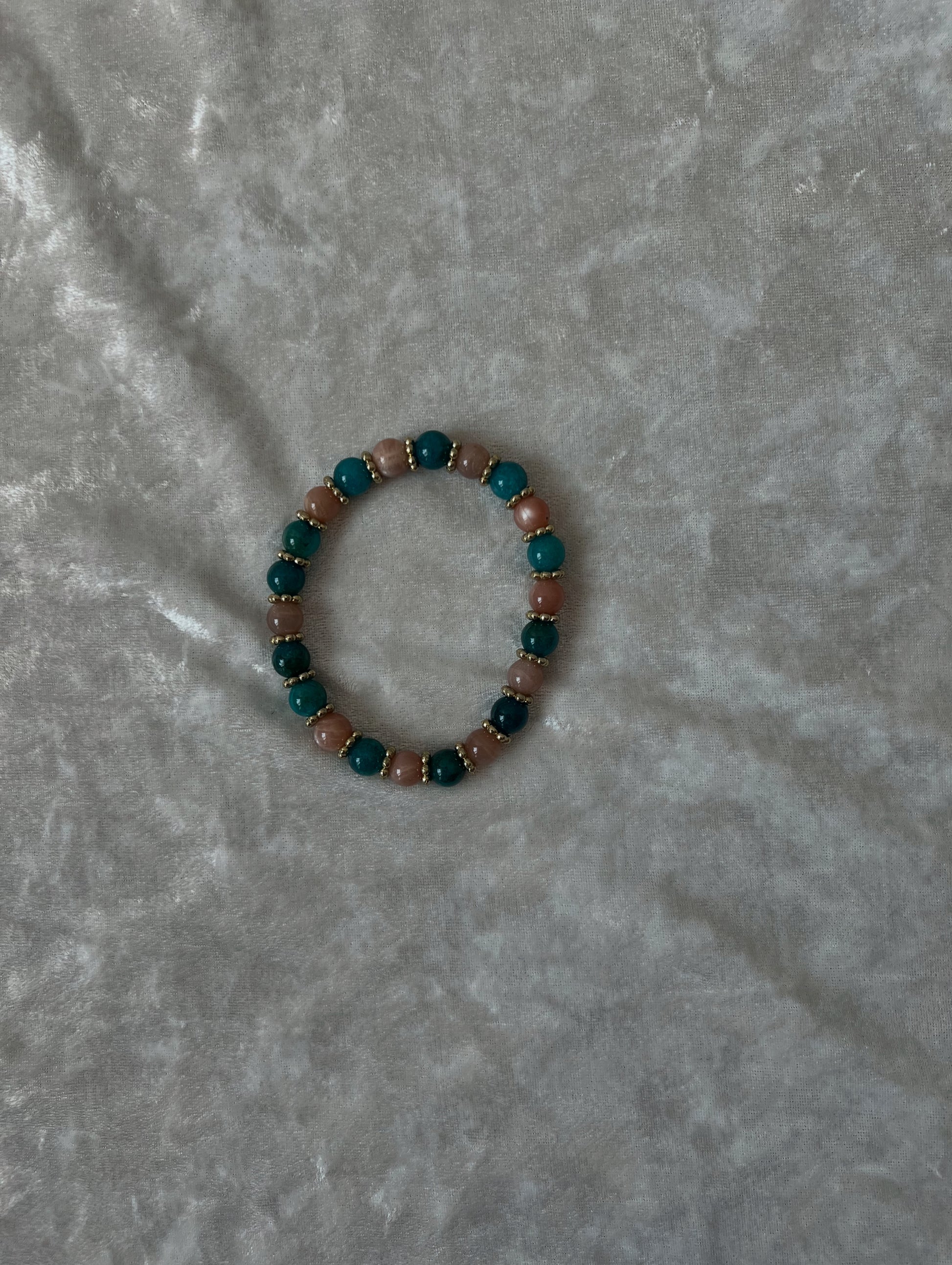 This handmade bracelet blends the radiant fire of Sunstone with the deep clarity of Blue Apatite, creating a channel between your solar plexus (power) and throat chakra (truth).