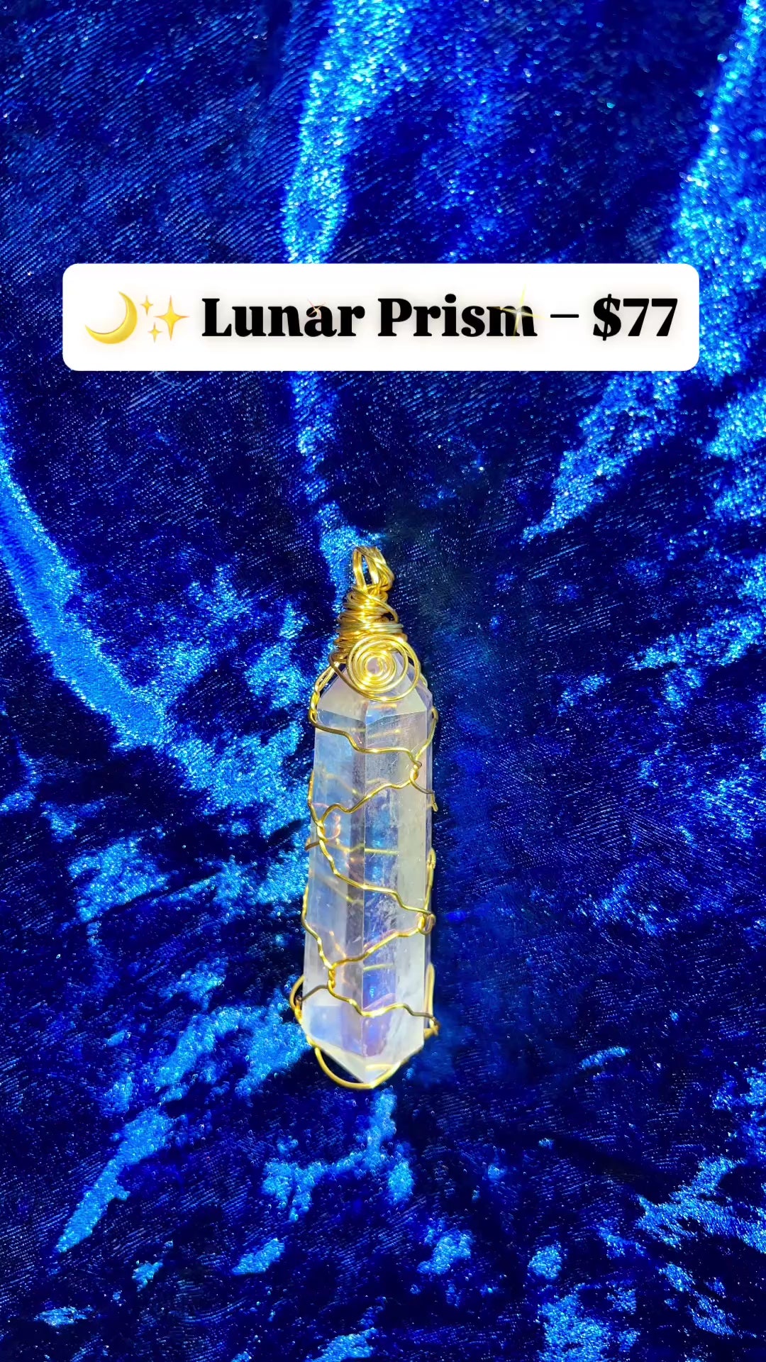 Unlock lunar magic with the Lunar Prism — a one-of-a-kind Angel Aura Quartz point wrapped in radiant gold wire and kissed by the moonlight. This ethereal crystal glows with soft iridescent rainbows, activating your crown chakra and helping you align with divine guidance, clarity, and inner peace.